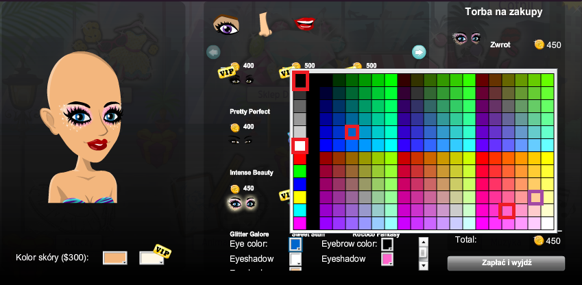 pierwszy kolor czyli kolor oczu zmieniamy na niebieski (jak komu pasuje). Drugi kolor czyli rzęsy zostawiamy bez zmian. Trzeci kolor czyli cienie do oczu dajemy biały a czwarty kolor dajemy na różowy. Natomiast ostatni piąty dajemy taki kolor jaki ma nasza twarz. Jeżeli ktoś woli inne kolory to może zmienić.