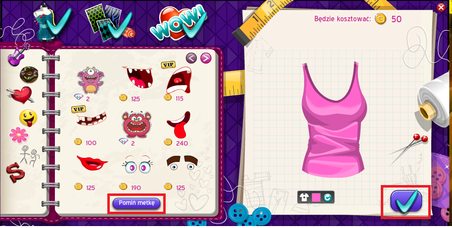 5. Teraz wyskoczą nam takie różne kokardki, kwiatki itd. to też pominiemy żeby też nie było drożej klikamy w taki sam znaczek jak w punkcie 4 tylko że tam pisze "pomiń metkę" pomijamy i potem dajemy koło bluzki taką fajeczkę żeby zapisać, dokładniej zaznaczona jest na obrazku: