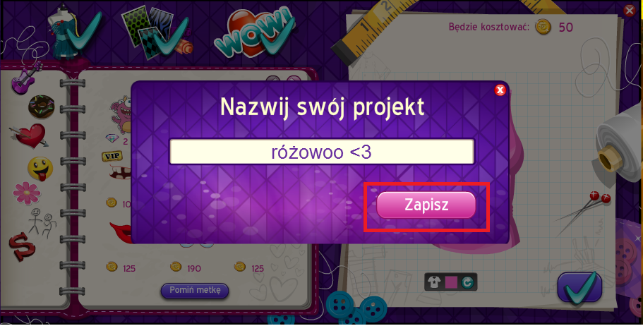 5. Teraz wyskoczą nam takie różne kokardki, kwiatki itd. to też pominiemy żeby też nie było drożej klikamy w taki sam znaczek jak w punkcie 4 tylko że tam pisze "pomiń metkę" pomijamy i potem dajemy koło bluzki taką fajeczkę żeby zapisać, dokładniej zaznaczona jest na obrazku: