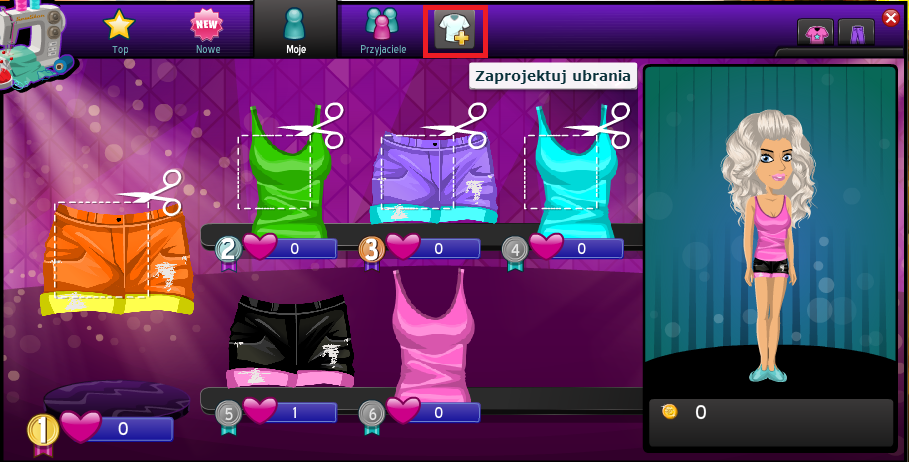 1. Wchodzimy w miasto filmów a potem w design studio klikamy w taką bluzkę u góry z takim plusikiem zaznaczona jest na obrazku czerwonym kwadratem: